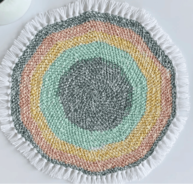 This simple round placemat pattern uses the herringbone double crochet. Â The fringe on the edge gives this placemat a bohemian vibe!