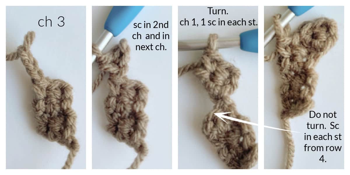 Row 4: Ch 1, 1 sc in each st. Do not turn. Ch 3, 1 sc in second ch from hook and in next ch. (4) Turn.
