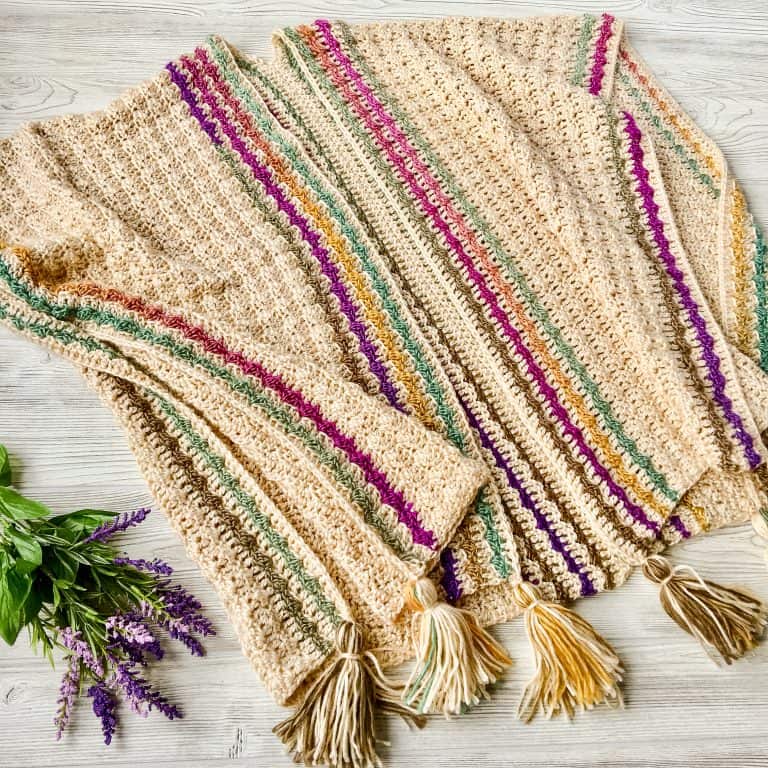 This crochet poncho pattern is a beginner friendly asymmetrical crochet poncho with a repetitive stitch pattern. Simple stitches and easy construction combine for a fun and easy beginner-friendly crochet poncho pattern.