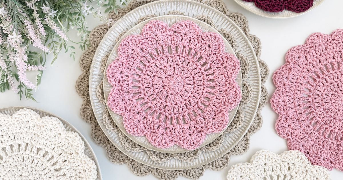Craft a gorgeous kitchen set with this crochet placemat pattern, including coasters and pot protectors in matching designs.