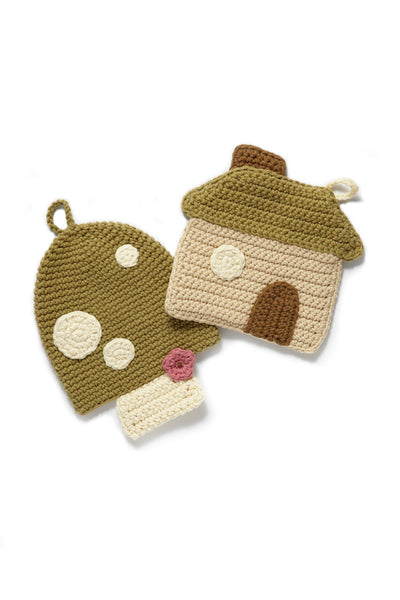 The Crocheted Little House Potholder is set of sweet cottage core patterns! and mushroom house pot holders!