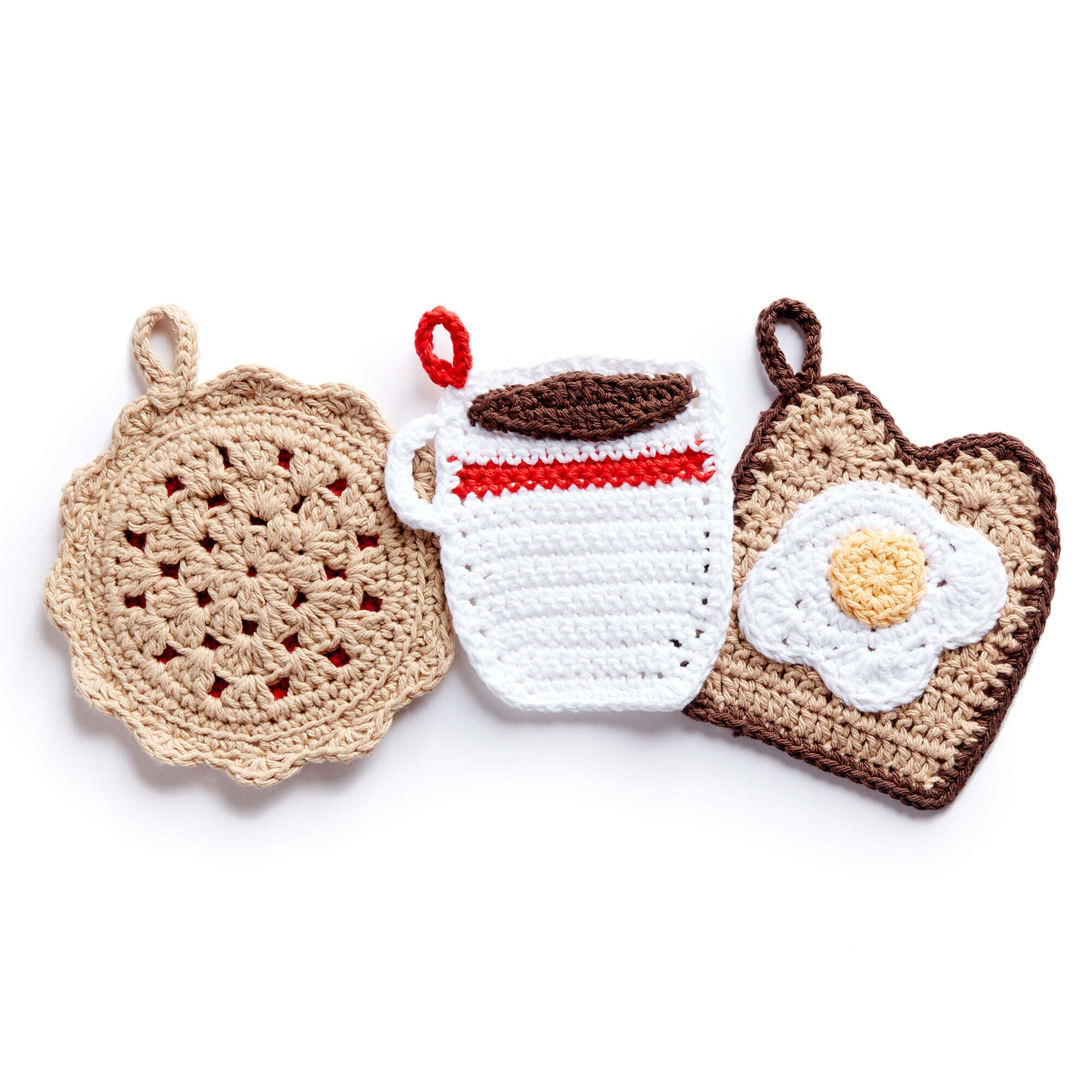 Eggs and Toast, Coffee, and Cherry Pie, oh my! These are the scrumptious forms you’ll crochet with this sweet pattern set that includes 3 decorative potholders.