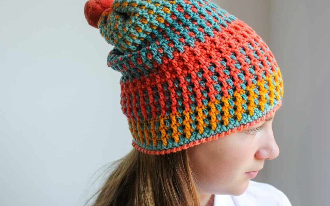 The Just Peachy Hat is a crochet hat that looks woven! So fun to make with a unique stitch & appearance! Made with self striping yarn for color work ease. #nanascraftyhome