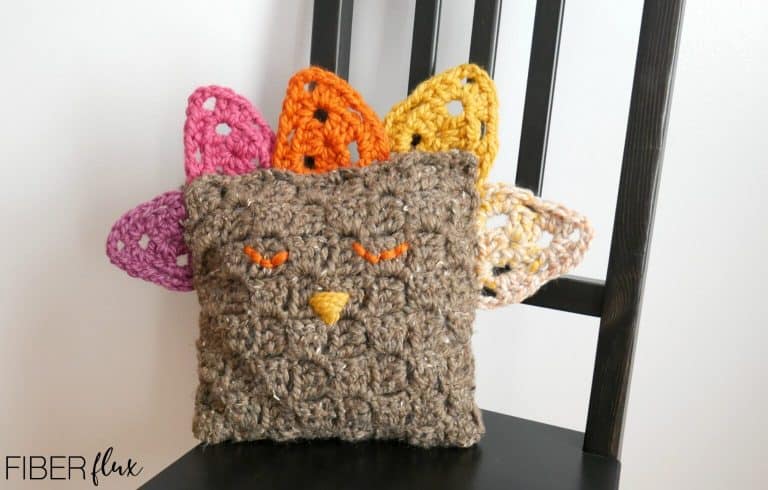 The Totally Turkey Pillow is a fun and easy to make pillow that is the perfect addition to your Thanksgiving decor! Made with Super bulky yarn for a quick make with the addition of feathers made with your scrap yarn!